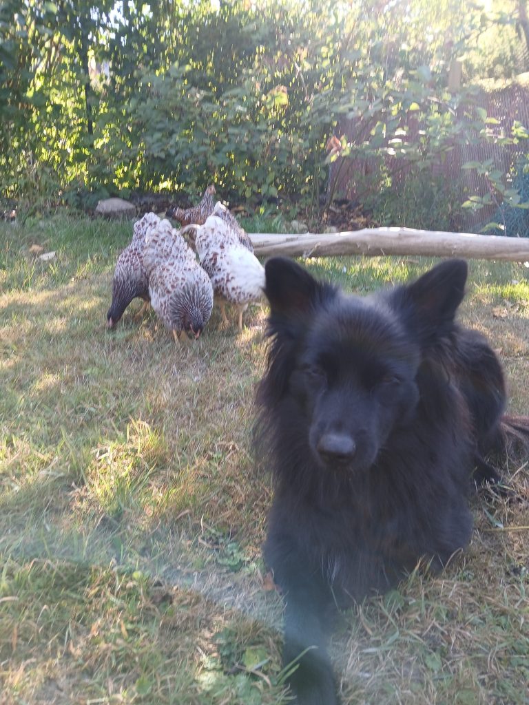 Hilda und Caty haben ihre Rassebeschreibung gelesen und verstanden, denn sie gehen vom ersten Moment super freundlich mit den gackernden Gartenbewohnern um ( Vizla Lord auch ). Bei Caty beschränkt sich das zwar auf ein herablassendes ignorieren der Federtruppe aber Hilda ist total begeistert von der Bande. Sie wedelt und fiept sie an und ist etwas enttäuscht, dass sie nicht mit ihr spielen aber eine artübergreifende Freundschaft ist schon entstanden. Super cool ist, dass Hilda sie wirklich beschützt, sie vertreibt alles was hier landen will und liegt mitten im Garten und springt wie vom Blitz getroffen auf, um die Hühnerscharr vor eventuellen Gefahren zu beschützen.
